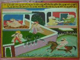 | Description / विवरण | Miniature painting based on Mullah-do-Piyaja depicting bad condition of a prostitute and depicts her moral downfall as she has union with many persons. |