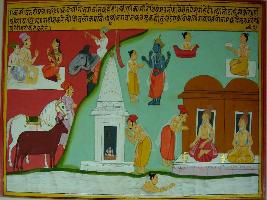 | Description / विवरण | Miniature painting based on Kashi khand depicting lord Vishnu standing with Dhruv at the centre, on its right a king seated with his son and a woman and below it king making alms in form of horse and cow. After it lord Vishnu tells Dhruv that those who give alms, get place in the Shiv lok. On the left of the painting two seated sage are depicted along with a king with folded hands and below it he takes bath in the river. |