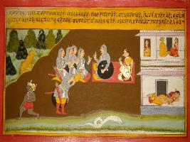 | Description / विवरण | Miniature painting based on Prithviraj Raso depicting Prithviraj and Sanjogita with their nobles on the centre of the painting. They say to his king that tiger and forest, both are incomplete without anyone. In the same way, Sheshnaag depends on the earth and earth depends on Sheshnaag. As simple as that, Kulavadhu and Kula are made for each other. In the same way nobles and king are born for each other. |