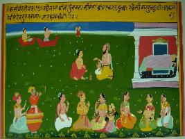 | Description / विवरण | Miniature painting based on Kashi khand depicting a two musicians seated on vimans. In middle a rishi is performing yagna, a small Brahman seated beside him. At upper left part a couple is sleeping. Musicians and a row of ladies seated below. |