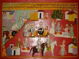 | Description / विवरण | Miniature painting based on Prithviraj Raso depicting two horsemen fighting, a king and queen sitting with four persons. On the lower part two horsemen are depicted talking to a king. |