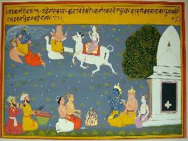 | Description / विवरण | Miniature painting based on Kashi khand. On the upper part Vishnu, Brahma and Shiv is depicted mounted on Garuda, Swan and Nandi. On the lower side in front of Shiv s temple, Brahma, Vishnu and Shiv are depicted sitting and a couple doing yagna and two people playing musical instruments dhol and shehnai. |