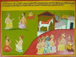 | Description / विवरण | Miniature painting based on Mahabharat - Rajdharma parva depicting Pandavas with Draupadi while Sukamani asks something Yudhisthir and in just lower to them a Brahman is talking with king Janaka and Mithilanagar also depict in the painting. |