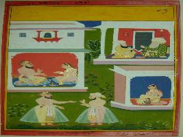 | Description / विवरण | Miniature painting depicting Mullah-do-Piyaja depciting two bearded men talking with one, probably Mullah do payaja narrating story to other at the upper left part. A man is shown sitting with his wife and son in his palace at upper right part. At the lower left part a woman is shown sitting inside palace with her small girl. At the lower right two men are shown standing and talking to each other. It is an incomplete painting. |