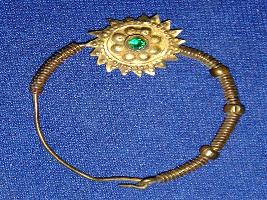 | Description / विवरण | Nose ring, made of metallic wire, with a loop. It has wiled design, a flat sun design with a green artificial stone in it, and coils with three beads at the lower side. |