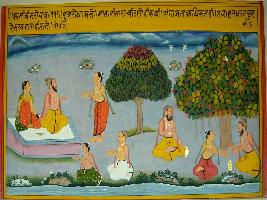 | Description / विवरण | Miniature painting based on Kashi khand depicting the duties of a son towards their parent. He should serve his mother and father and wash their feet with Gangajal. |