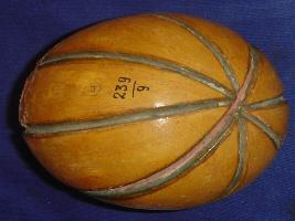 | Description / विवरण | Wooden model of kharbuja, painted in mustard yellow colour with green outlines. It is made in two halves and joined with a ball inside it. Colour is flaking at one side. |