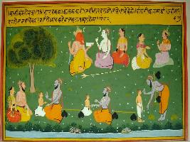 | Description / विवरण | Miniature painting based on Kashi khand. Narad is depicted here talking, teaching a child, the child is probably a son of rishi, On the upper part Ganesh, Shiv and three figures are depicted. |