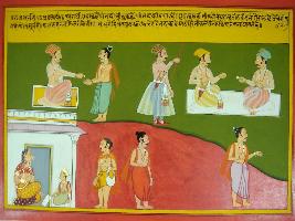 | Description / विवरण | Miniature painting based on Mahabharat - Rajdharma parva. The painting depicts that the man who tell lie is not fit for friendship and in order to except money if anybody leave his own place than he is a stupid. On the painting depicts a woman and a priest and two nobles in order to narrate the story. |