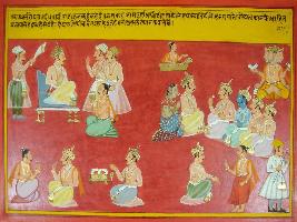 | Description / विवरण | Miniature painting based on Mahabharat - Rajdharma parva depicting Pandavas and king Janaka and a priest and Brahma is seen on top. The painting refer to look after the subjects and consider the guest as Devtas and much offer best hospitality to a guest and by doing this a king get place in heaven Brahma lok. |