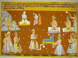 | Description / विवरण | Miniature painting based on Raghuvansha. On the upper part a lion and Sadashiva are depicted. In the left part, two kings are sitting, one of them is king Bhoj. On the lower part a king with attendants are depicted, along with a throne. |