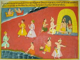 | Description / विवरण | Miniature painting based on Raghuvansha depicting a sage outside his hermitage and a king and queen in front of him with folded hands depicting common people, a king, a sage and celestial beings engaged in their respective acts like working, hunting, yagna etc. |