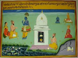 | Description / विवरण | Miniature painting based on Kashi khand depicting sage and her wife with their child sitting in front of Krishna. Later the sage is depicted worshipping Shiv. |