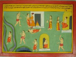 | Description / विवरण | Miniature painting based on Mahabharat - Vana parva. This painting depicted Lomash rishi telling stories to Yudhisthir about a sage. One demon is shown coming for him in the painting. He is going to river which dried up on his coming. At the upper right part, his father is shown embracing him. Near by yagna is being carried out. At the upper left part, a woman is shown coming and meeting the sage. |