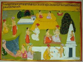 | Description / विवरण | Miniature painting based on Kashi khand depicting a villagers are busy with their different professions, like temple builder, some giving donation get heaven. |
