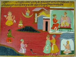 | Description / विवरण | Miniature painting based on Raghuvansha depicting Brahma seated on right upper, while moon watching him. On left upper part a king is talking to his minister. Two men on left side standing together watching snake and a man seated on other side. |