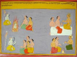 | Description / विवरण | Miniature painting based on Mahabharat - Rajdharma parva depicting Yudhisthir telling Arjun about yagna performed by Indra and Shiv s appearance from fire alter. |