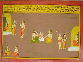 | Description / विवरण | Miniature painting based on Mahabharat - Vana parva depicting scenes of Vana parva depicting Vakriti rishi coming to ashram of Vaishya rishi and getting excited after seeing his daughter at the right part. In the middle of painting, demon and a girl are shown coming out of yagna of Vakriti rishi. |