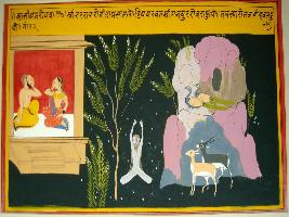 | Description / विवरण | Miniature painting based on Kashi khand. On the left side is the depiction of a rishi and his wife. On the right side is a lean sage doing penance and there is painting of peacock and deer on the wall. |