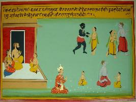 | Description / विवरण | Miniature painting based on Kashi khand depicting sage and his wife talking to his son at right side. To its left son is shown doing penance, At the lower left, Mahadev revealing himself to son. He is shown talking to Kaal. To its left, he is shown walking with Mahadev. |