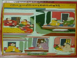 | Description / विवरण | Miniature painting based on Mullah-do-Piyaja depicting Mullah-do-Piyaja telling Akbar about the sexual desire of a king with queens. In the lower part a loving union of the king is depicted. |