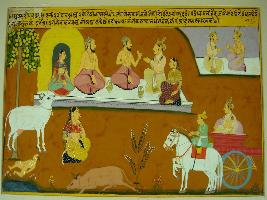 | Description / विवरण | Miniature painting based on Raghuvansha depicting seated king Sunka with his queen in front of two sages, on it left king seated in front of Indra with folded hands. On the extreme right corner of the painting Kalpataru and Kamdhenu are depicted. |