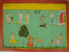 | Description / विवरण | Miniature painting based on Mahabharat - Vana parva depicting a man is performing yagna at lower left part, To its right, another man is pulling his sword to kill goat. At the lower right, one man is eating food. Above this man is serving food to two men. At the upper left, a man is shown standing with another man. |