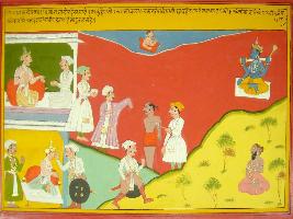 | Description / विवरण | Miniature painting based on Mahabharat - Rajdharma parva depicting that the king who punishes thieves, serves sages and yogis, serves and look after his peoples and moves to forest after handing over his empire to his son will get moksha. |