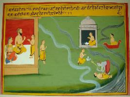 | Description / विवरण | Miniature painting based on Kashi khand depicting a seen of worship of Shiv, where a boy was told by his parent for worshipped Shiv and he boy also seen in painting worshipping Shiv ji in never bank. |