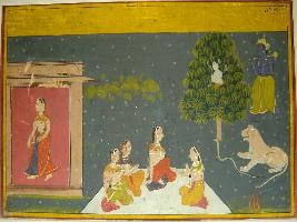 | Description / विवरण | Miniature painting based on Rasikpriya depicting Radha sitting with three gopis and talking, Kamdev with bow seated on tree, near him Krishna is depicted. A tiger with a snake is also shown. |