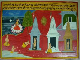| Description / विवरण | Miniature painting based on Kashi khand depicting Agni coming to visit Kashi. At first he took bath in Manikarn, then visit vishweshwar, Kal bheirava etc. At the upper right, Chandrama is seen in the sea and Lakshmi is also depicted on the sea. The painting is in complete. |