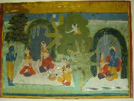 | Description / विवरण | Miniature painting based on Rasikpriya depicting Krishna standing near Radha and Gopis. Besides them, Kamdev, sitting in tree and aiming his arrow at Radha and Radha is depicted, Lost in love. In left part, Krishna and Radha are sitting together. |