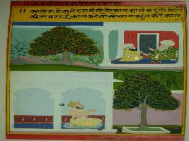 | Description / विवरण | Miniature painting depicting Akbar and Mullah-do-Piyaja talking. On the lower part a man is depicted worshipping with folded hands. |