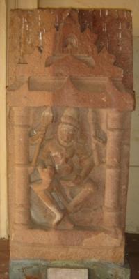 | Description / विवरण | Independent sculpture of four handed Chamunda in dancing pose in a pillared niche. Her attributes from right below- 1 dagger 2 trident 3 Kharbhanga 4 kapala. Her right breast is partly chopped off. She is wearing a garland of skull and dancing on a corpse. |