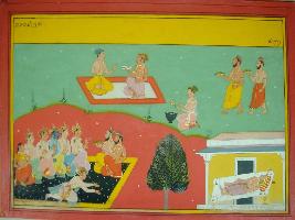 | Description / विवरण | Miniature painting based on Mahabharat - Vana parva depicting two rages shown coming with plate of pan at upper left part. At the lower left part, Pandavas and Draupadi are shown sitting and sages are presenting pan to them. Yudhisthir is shown kneeling down. At the upper middle part, two men shown sitting. At the lower left part, a man is shown lying on bed in his palace. |