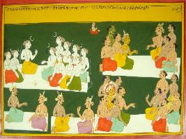 | Description / विवरण | Miniature painting based on Mahabharat - Rajdharma parva depicting one who worship 11 rudras and a Aditya he will get heaven and moksha. |