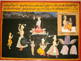 | Description / विवरण | Miniature painting based on Kashi khand depicting Agni worshipping Shiv but Indra coming out instead and asking him, whatever he wants. But Agni tells him what will he give him, when he himself has five holes in his body. |