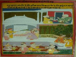 | Description / विवरण | Miniature painting based on Mullah-do-Piyaja depicting on the upper left Mullah-do-Piyaja telling Akbar about a man who is making many excuses to meet his wife. |