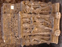 | Description / विवरण | Independent sculpture of Krishodhri Chamunda, she is depicted holding trident by her right hand and Kharbhanga on left hand. She is depicted in pillared niche, female Shivganas are depicted on her both sides. Parikar is present on her head and on the topmost part figures holding garland are depicted, and an animal probably a dog is also depicted. |