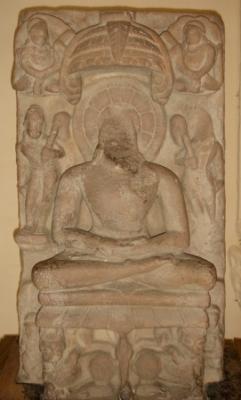 | Description / विवरण | Independent sculpture of Jain Tirathankara Chandra Prabhu sitting in Padmasana on a high pedestal under a canopy. His head is chopped off and nimbus is seen behind head. Below the pedestal one lion is seen in each side. At its right a seated male figure is depicted almost mutilated and to its left a seated female is depicted. Above it on its each side a male chauri bearer is seen but the head of left one is chopped off. At both sides of the canopy one garland bearer is seen in each side. |