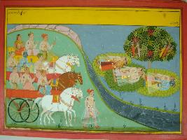 | Description / विवरण | Miniature painting based on Mahabharat - Vana parva depicting travelling of Pandavas with Draupadi to vana for 13 years exile. At the right part, they are shown leaving in chariot for van and a river is depicted in middle of painting. At the left part, Pandavas and Draupadi are shown steeping under tree inside forest their weapons are hanging on tree. |