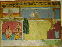 | Description / विवरण | Miniature painting based on Rasikpriya depicting Krishna meeting Radha. At the lower right, Radha sitting with female attendants. To its left, Radha is shown going towards terrace. At upper left, Krishna is shown embracing Radha and at the upper right, they are sitting together. |