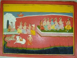 | Description / विवरण | Miniature painting based on Mahabharat - Vana parva depicting Pandavas and Draupadi sitting with folded hand and Vyas rishi preaching to them at left part. At the right part, Shiv and Parvati are shown sitting in front and giving boon to Indra, Kartikeya and Prajapati who are sitting with folded hand. Ganga is show coming from Gomukh tiger and Nandi is depicted sitting near Ganga. a god is sitting on Vayu yaan is throwing flower on them. |