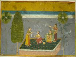 | Description / विवरण | Miniature painting based on Rasikpriya depicting two Nayikas sitting on a platform, while two other Paricharikas are serving them. Three trees are depicted near them. |