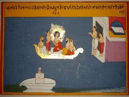 | Description / विवरण | Miniature painting based on Kashi khand depicting a devotee along with his mother, father, friends went to the court of Shiv linga. At upper left part two dwarpals greeting them on their arrival. |