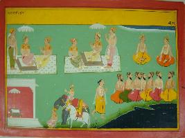 | Description / विवरण | Miniature painting based on Mahabharat - Vana parva depicting a group of Sages is sitting on left part of painting. In upper part a king is depicted sitting with his minister. |