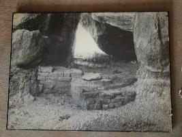 | Description / विवरण | It is a photograph of rock shelter which is kept in a wooden frame showing with the help of transparent plastic. It is showing six lines of bricks in rock shelter along with two men. |