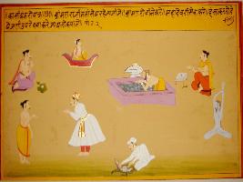 | Description / विवरण | Miniature painting based on Kashi khand depicting a yogi eating, a yogi on viman, a rishi taking bath in pond, a rishi doing penance, a man killing a sheep s kid, a noble man standing with folded hand in front of a rishi. |