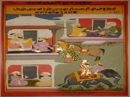 | Description / विवरण | Miniature painting based on Mullah-do-Piyaja. It depicts some people search thin shelter by themselves, just like housemen and elephant man search their space no one need to tell them about where to tie elephant and horse. |