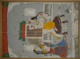 | Description / विवरण | Miniature painting of a toilet scene depicting a seated female combing her hair. With a female attendant holding out the mirror for her. The birds and fishes are looking up, admiring her beauty. |